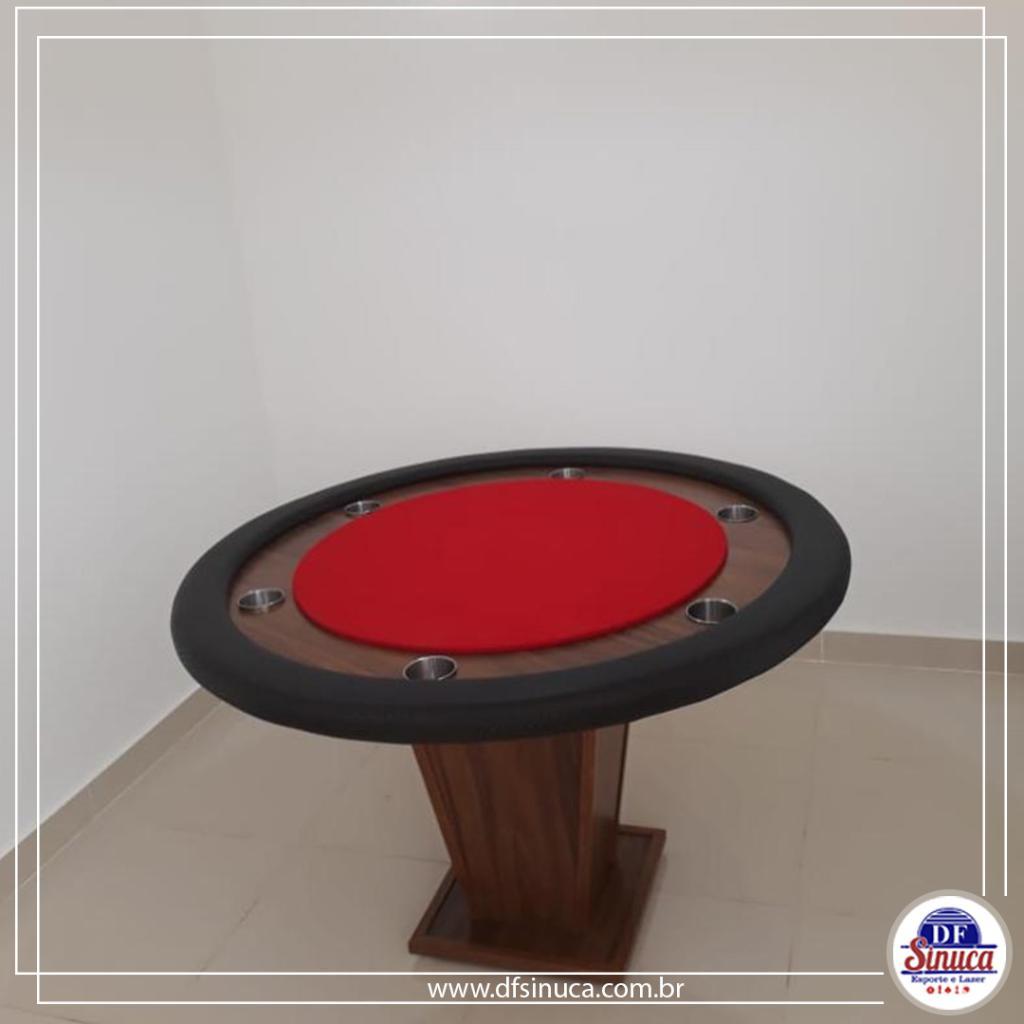 Mesa de Carteado redonda em MDF, revestido de fórmica preta auto brilho, pista com 06 porta copos, centro acolchoado e revestido em pano acrílico verde; bordas com espuma interna e revestidas de courvim automotivo; pé cônico central com sapata protegida com cantoneiras de alumínio. Possui mini pés niveladores.