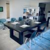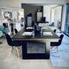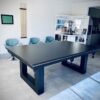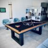 Mesa de Jantar/ Sinuca Residencial Unique com pano acrílico, com sistema de caçapas padrão residencial, com área de jogo em pedra ardósia, estrutura com revestimento TX de alta resistência, tabelas em madeira maciça, sucupira-amarela e pés niveladores em alumínio. Mesa com opção de adaptação para tênis de mesa com medidas oficias e suporte para tampo.