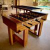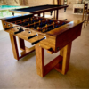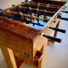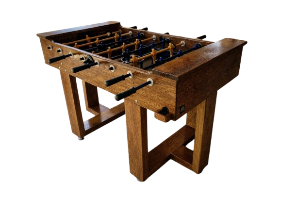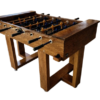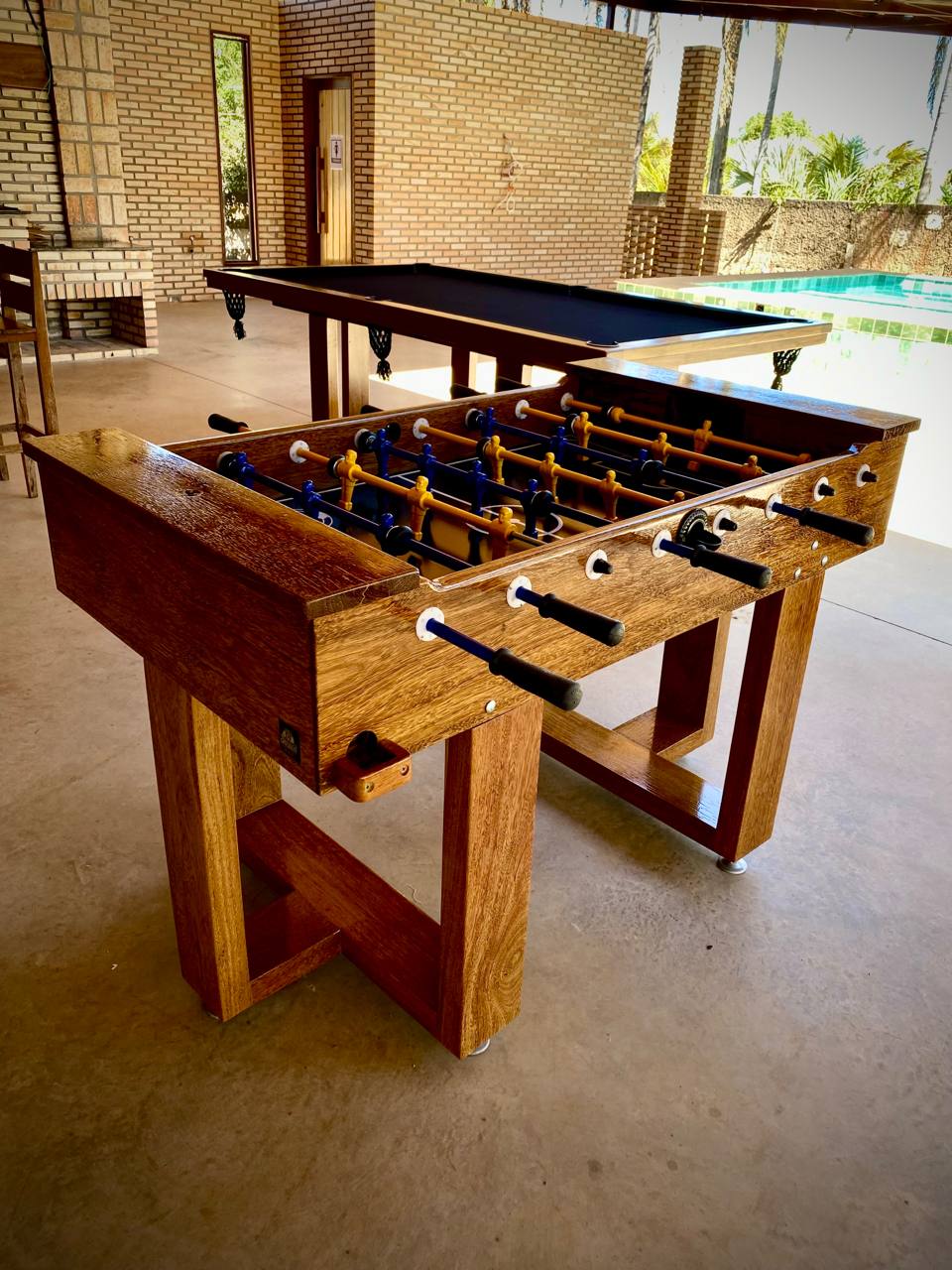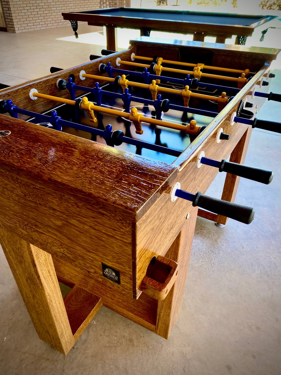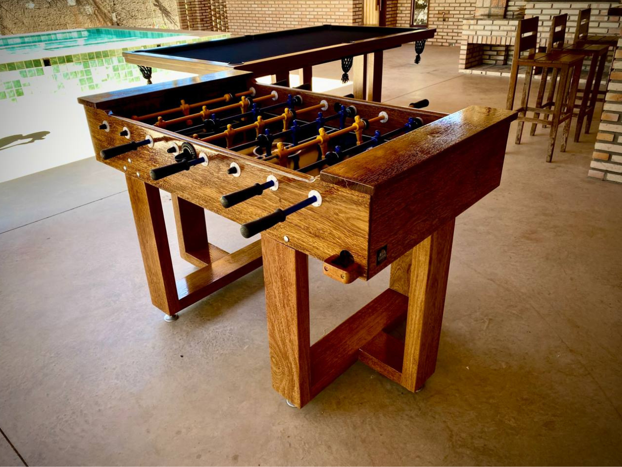 Com jogadores em ferro embutido em pintura eletrostática, pé nivelador embutido emborrachado de alta aderência, sendo a mesa feita tem madeira maciça Sucupira.