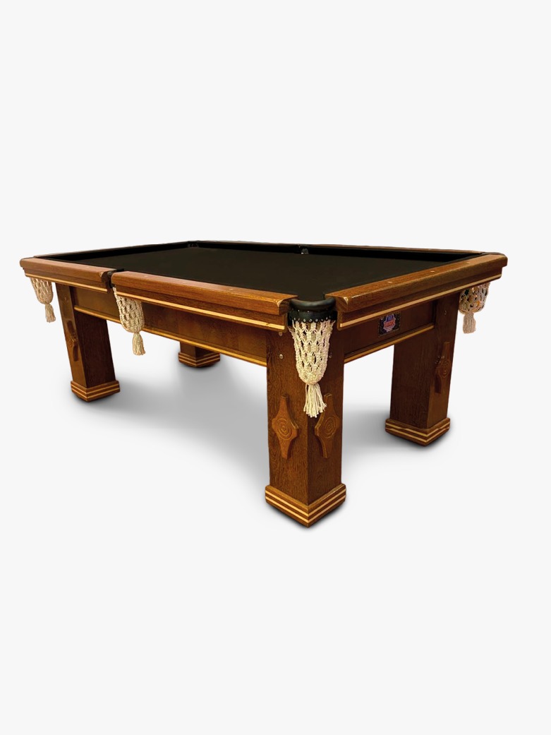 Mesa de sinuca modelo Residencial Luxo, com tecido acrílico verde, tampo em pedra ardósia e tabelas com excelente resposta para jogadas precisas.