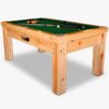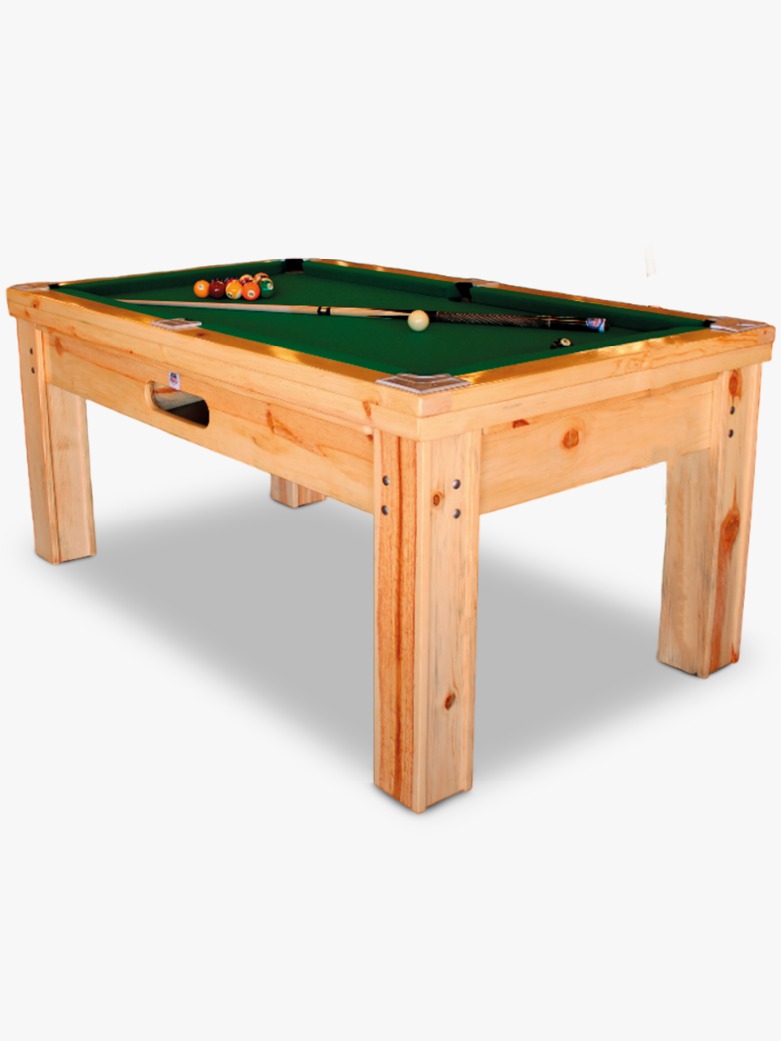Mesa de sinuca modelo Puccini, com campo (área de jogo) em pedra ardósia, tecido acrílico verde,sistemas de caçapas de alumínio padrão comercial, tabelas em madeira maciça (sucupira), estrutura revestida em madeira maciça (pinus) com pés niveladores de alumínio.
