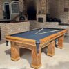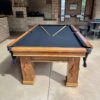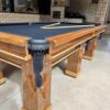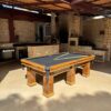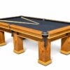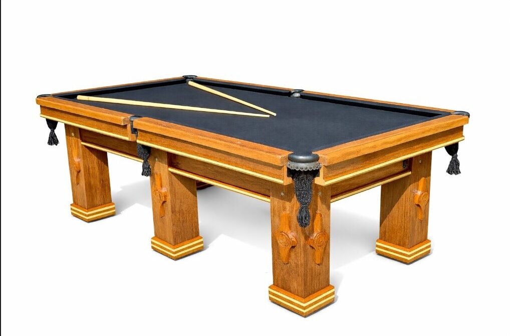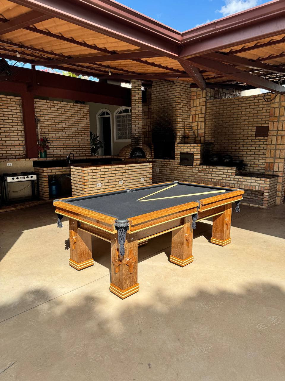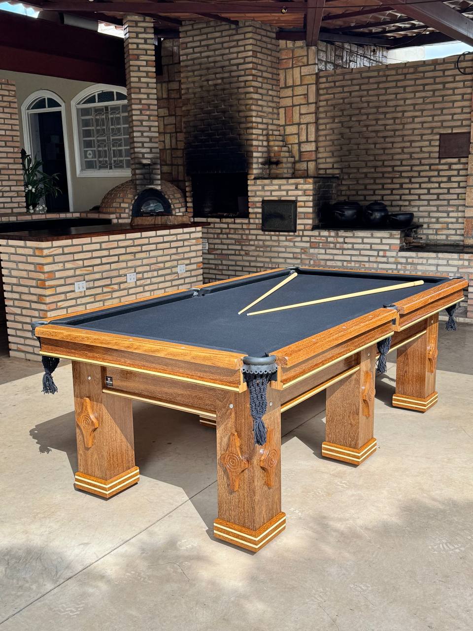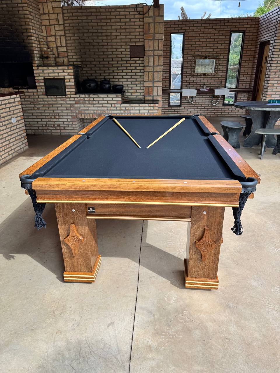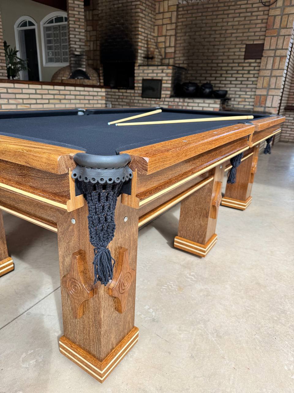 Mesa de Sinuca Modelo Semioficial Super Luxo com pano acrílico verde, 06 pés, tampo em pedra ardósia, estrutura revestida em compensado de Sucupira com tabelas e acabamentos em madeira maciça sucupira e pés niveladores em alumínio.